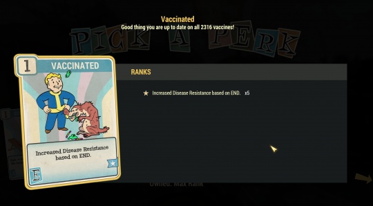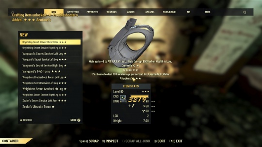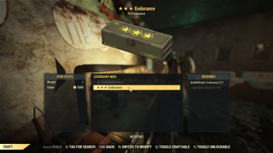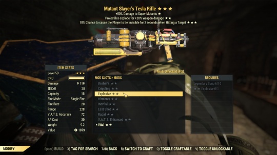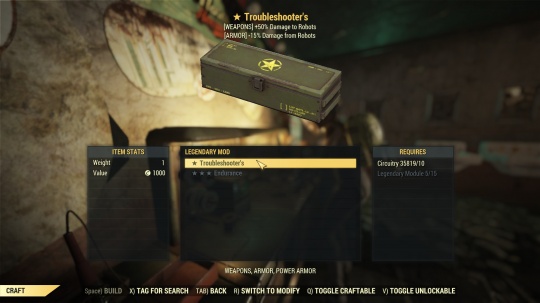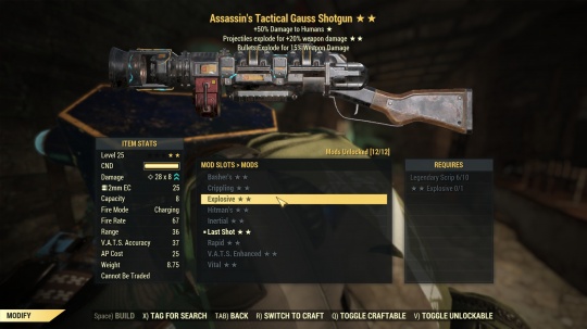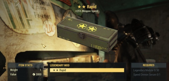 Scrappando leggendarie si potranno droppare modifiche leggendarie o imparare progetti per fare le modifiche Per craftare le modifiche, dopo aver imparato il progetto, serviranno leggendari (15 per la prima stella, 30 per la seconda e 60 nella terza più un oggetto a seconda della modifica) Con le modifiche (più 10 scrip) si potranno cambiare la prima/seconda/terza stella Le modifiche saranno scambiabili Una volta applicata una modifica l'arma non sarà più scambiabile I moduli passeranno a 0.15 di peso e saranno considerati materiali (immettibili nella scrapbox) I moduli si otterranno dagli eventi (almeno i pubblici) che non dropperanno più nuclei leggendari I nuclei leggendari non esisteranno più e saranno convertiti 1:1 in script (il cap dovrebbe passare a 11k) Non ci sarà il roll casuale per armi o armature già a 3 stelle Si potranno aggiungere stelle casuali per armi o armature bianche o a meno di 3 stelle al costo di 15 moduli Tornano gli esplosivi sulle armi ad energia (ma saranno simili a quelli sulle balistiche, non più come le legacy) I perk degli special aumenteranno di 2 punti quello special sulle armature e 3 sulle armi Aumenterà notevolmente il costo SPAV per lo sparachiodi (mediamente da 2 di costo per un 25 spav ridotto si dovrebbe passare a 9) e diminuirà di parecchio anche il fire rate (da 75 a 48) Ci sarà lo storico delle vendite al camp Si potrà segnalare il proprio camp e gli altri utenti potranno mettere like Ci sarà un nuovo evento di scorta bramini startabile dal player. Avrete una vostra base. Tale evento sarà ripetibile, sbloccherà una nuova valuta e permetterà upgrades di base e inventario dei commercianti. Tanti progetti nuovi tra cui una carabina laser. 4 carte cambiate in costituzione. Ora ognuna con una sola stella. Tutte applicavili a seconda della costituzione e solo se non si è ammalati (tra parentesi valori testati con 10 COS):